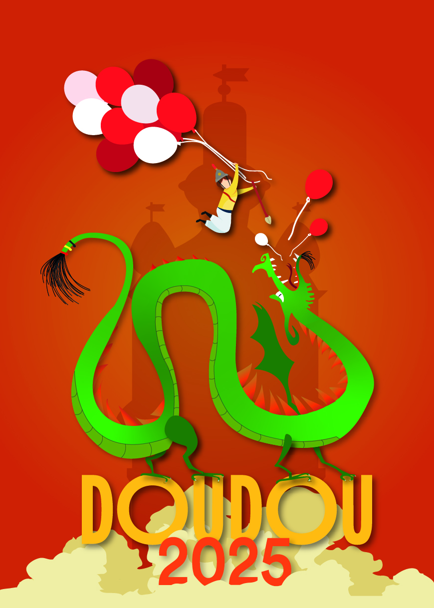 Illustration du combat légendaire entre Saint Georges et le dragon, symbole fort de la tradition montoise. Une création contemporaine et festive qui mêle couleurs vives, formes stylisées et références symboliques, en hommage à ce patrimoine inscrit à l’UNESCO.
